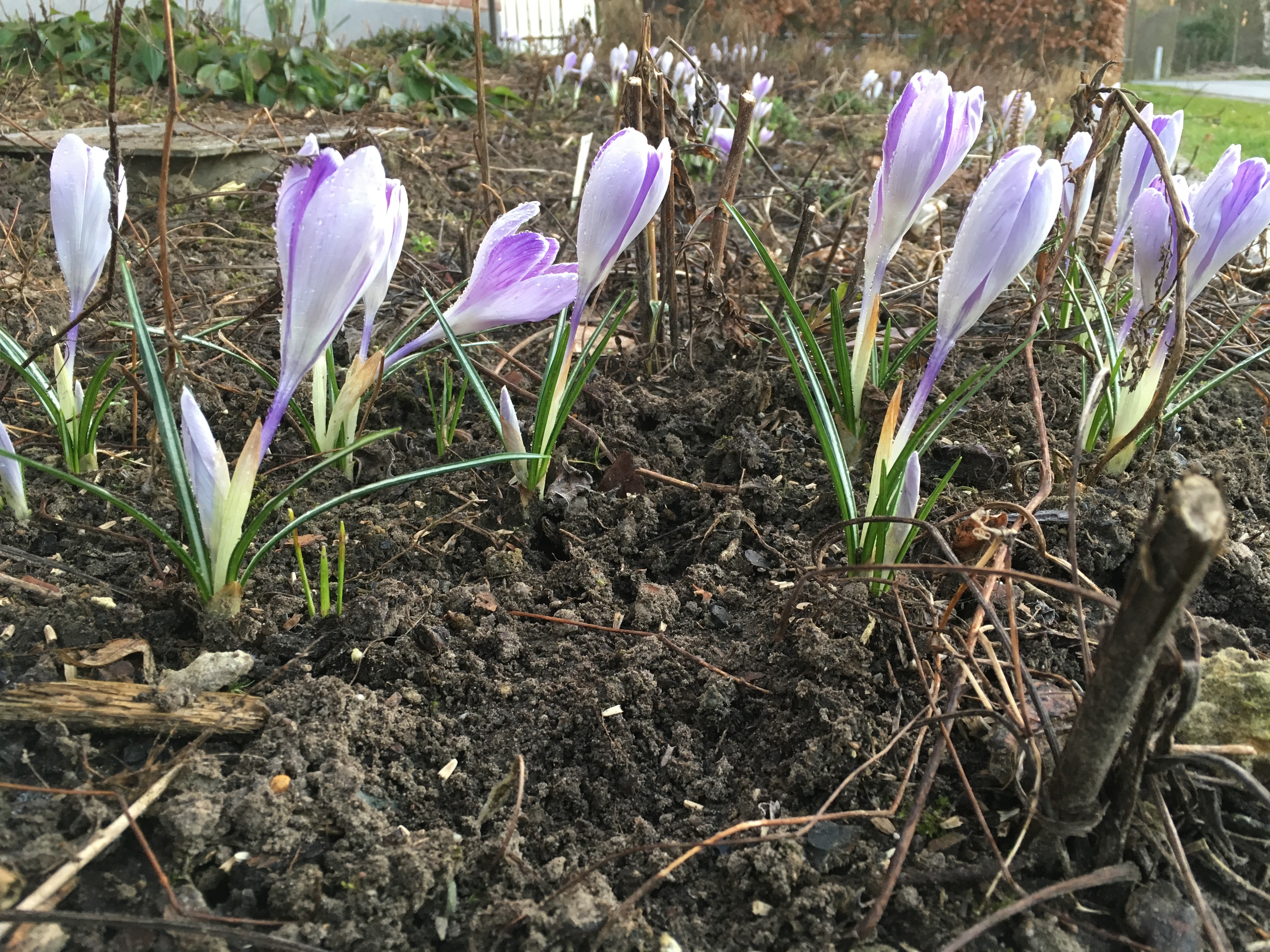 Voor tuiniers niet gemakkelijk. Maar wel leuk op dit moment. We mogen eraan beginnen want krokussen staan ineens volop in bloem. Zelfs de eerste narcisjes openen hun bloemknoppen. Gisteren zag ik op tv dat er al ‘kweetniehoeveel’ ooievaars in ons land zijn toegekomen. Dan is de lente begonnen, zeggen ze hè.