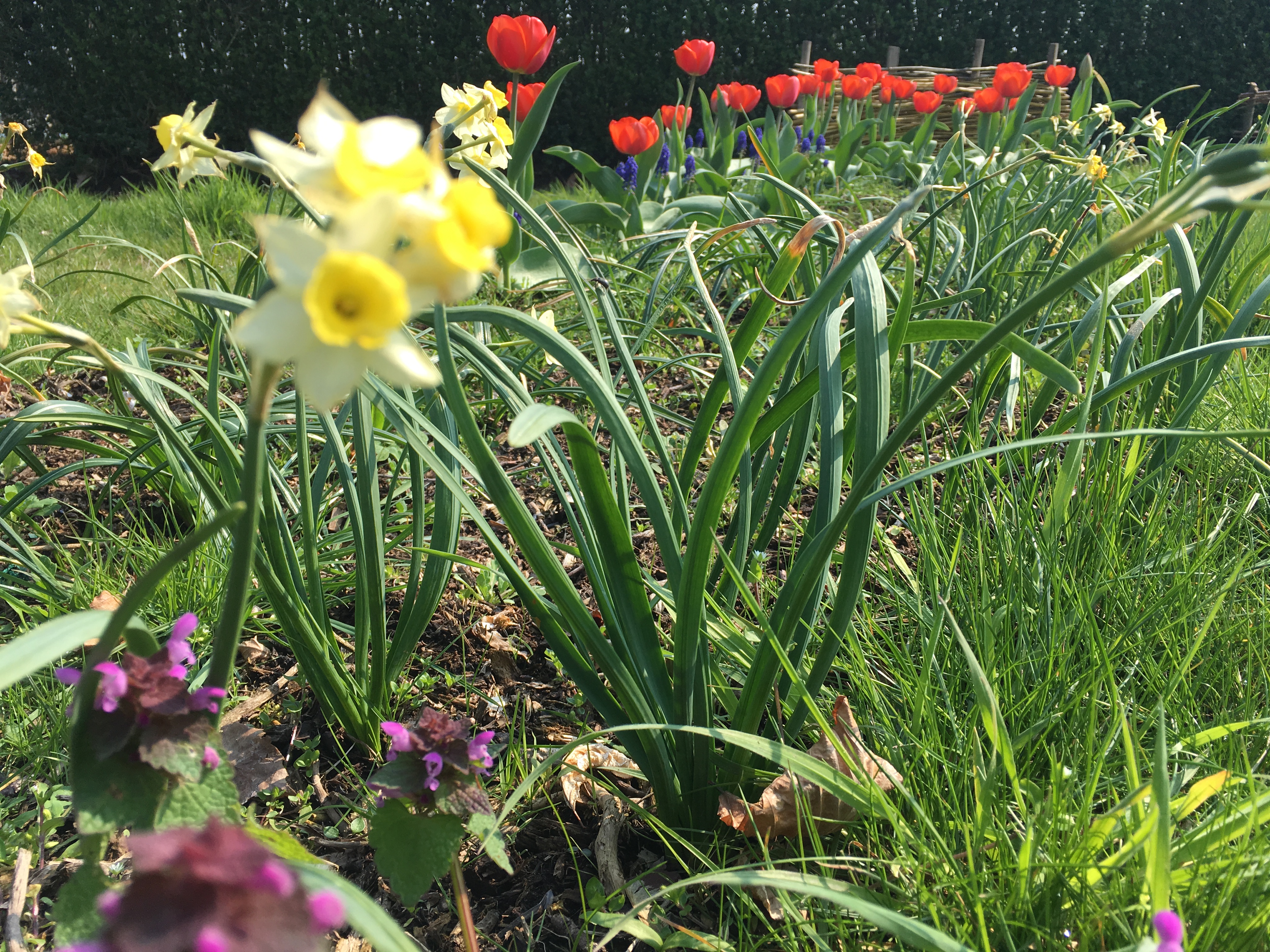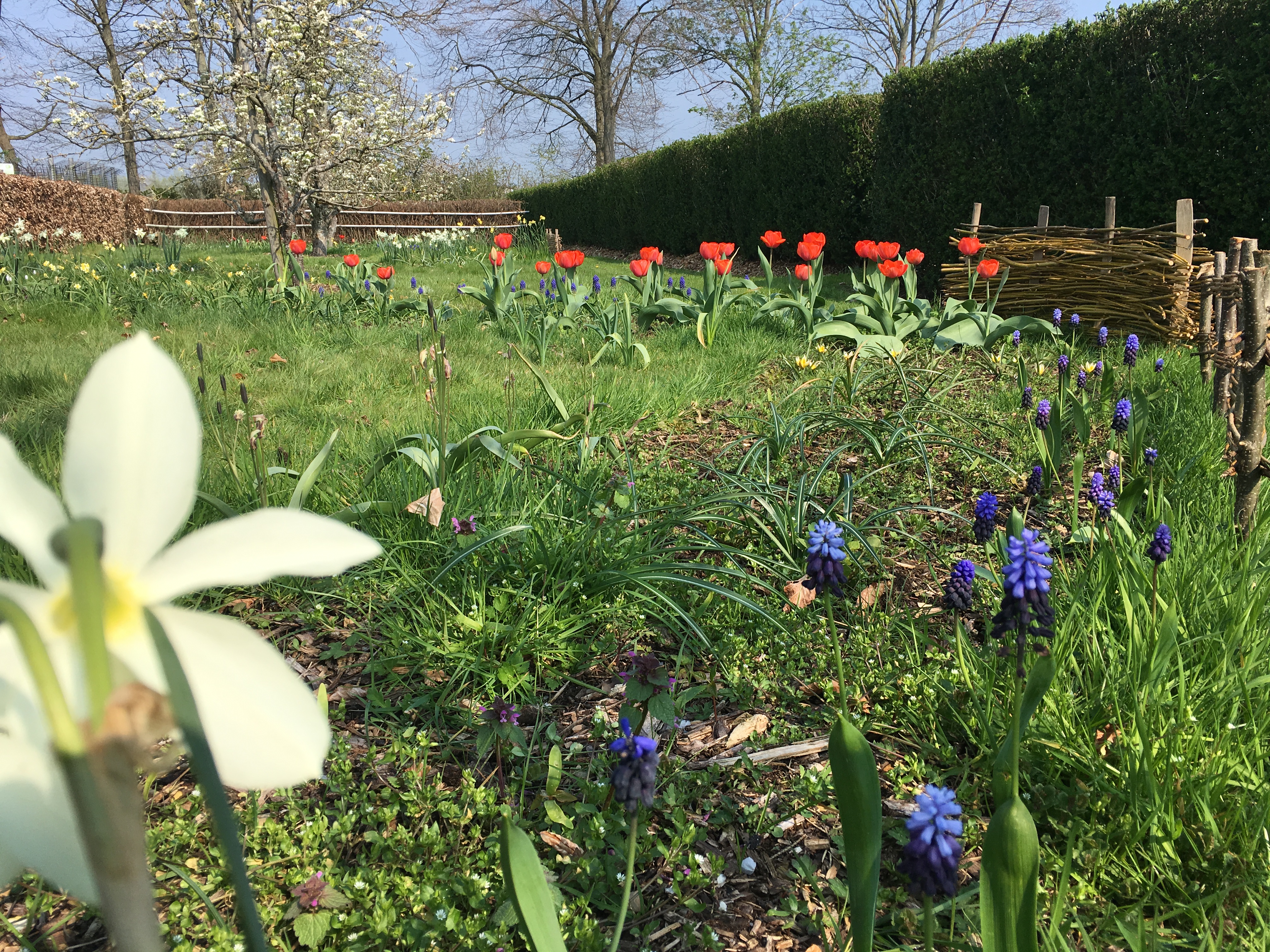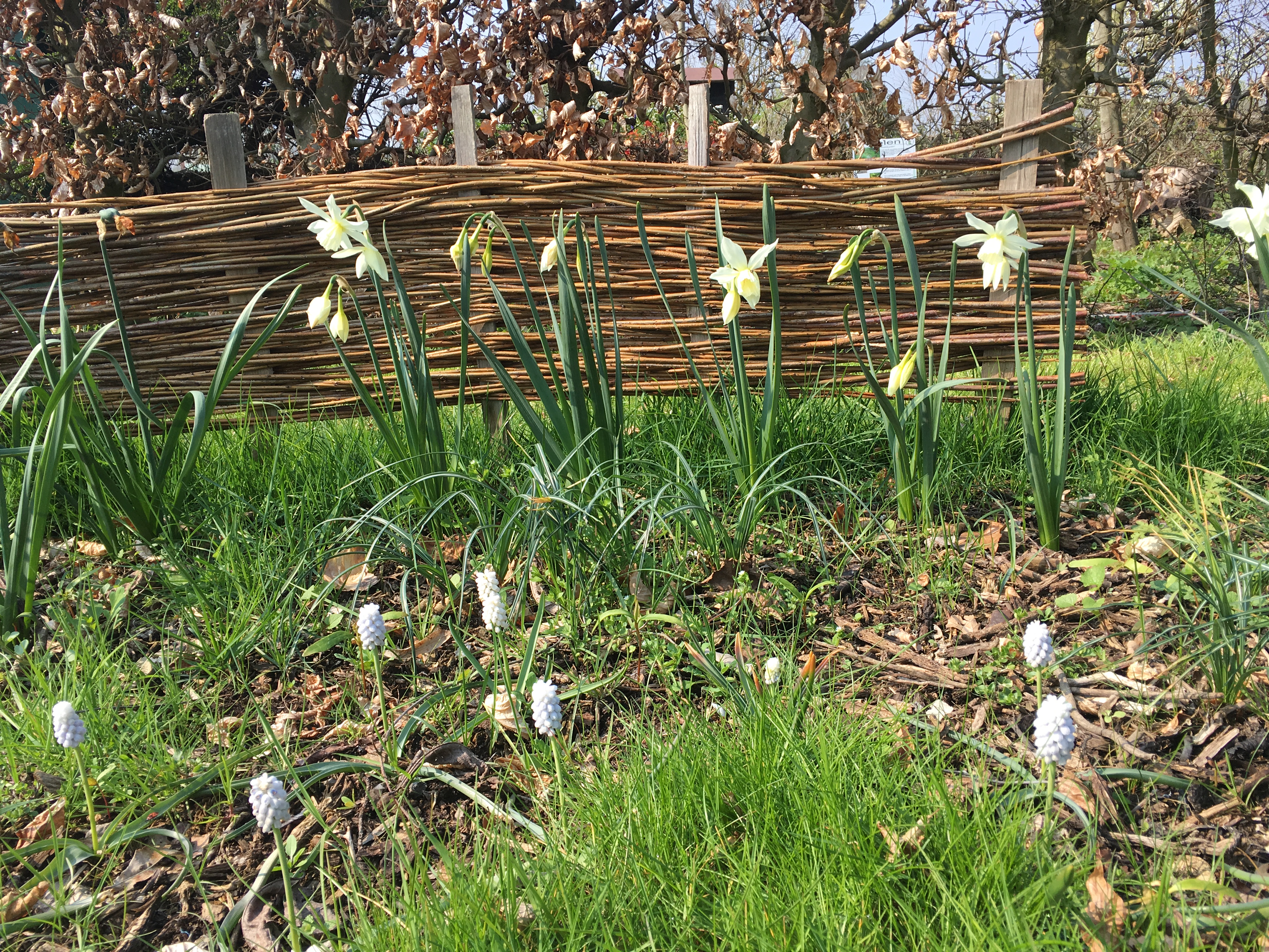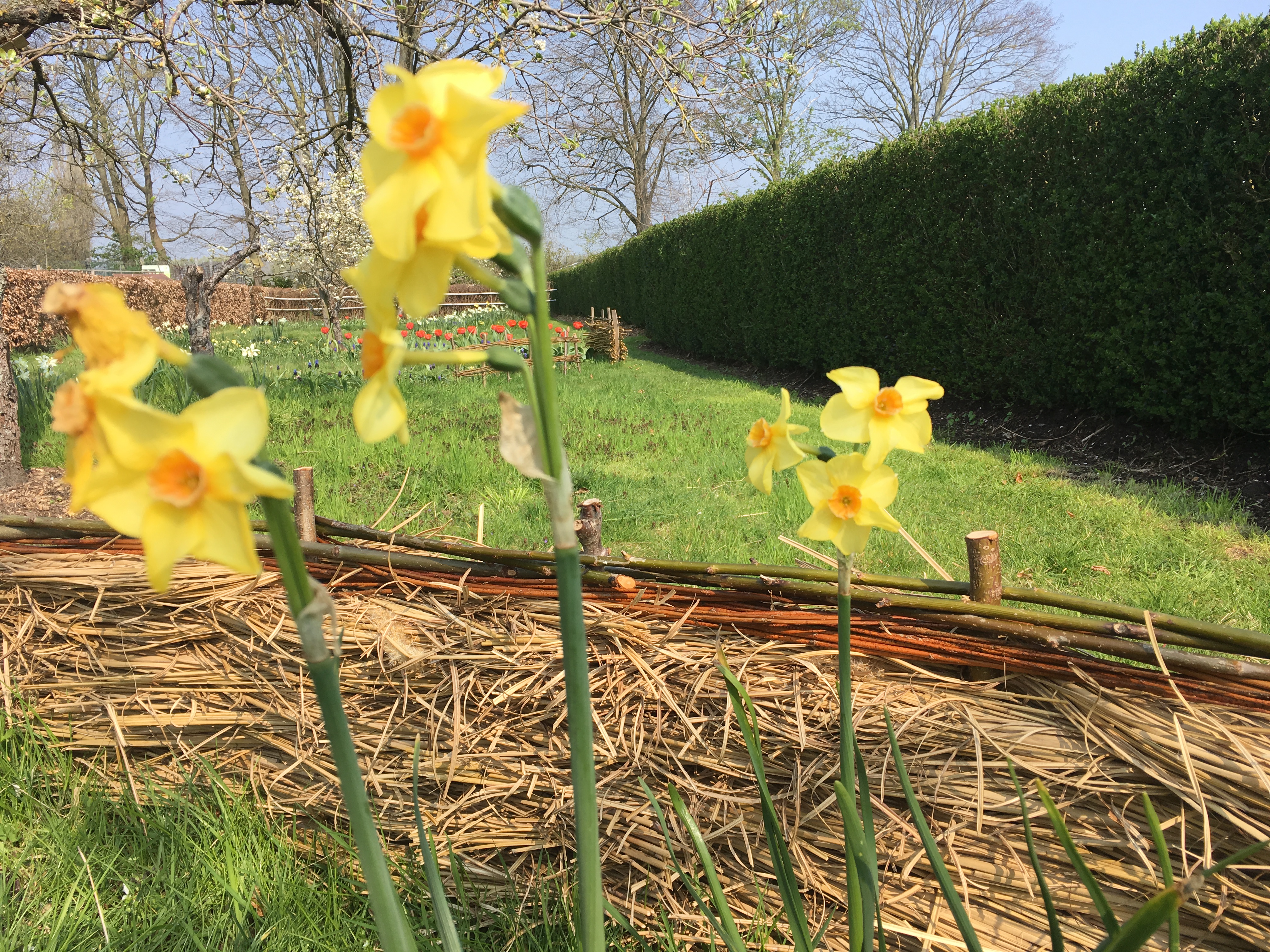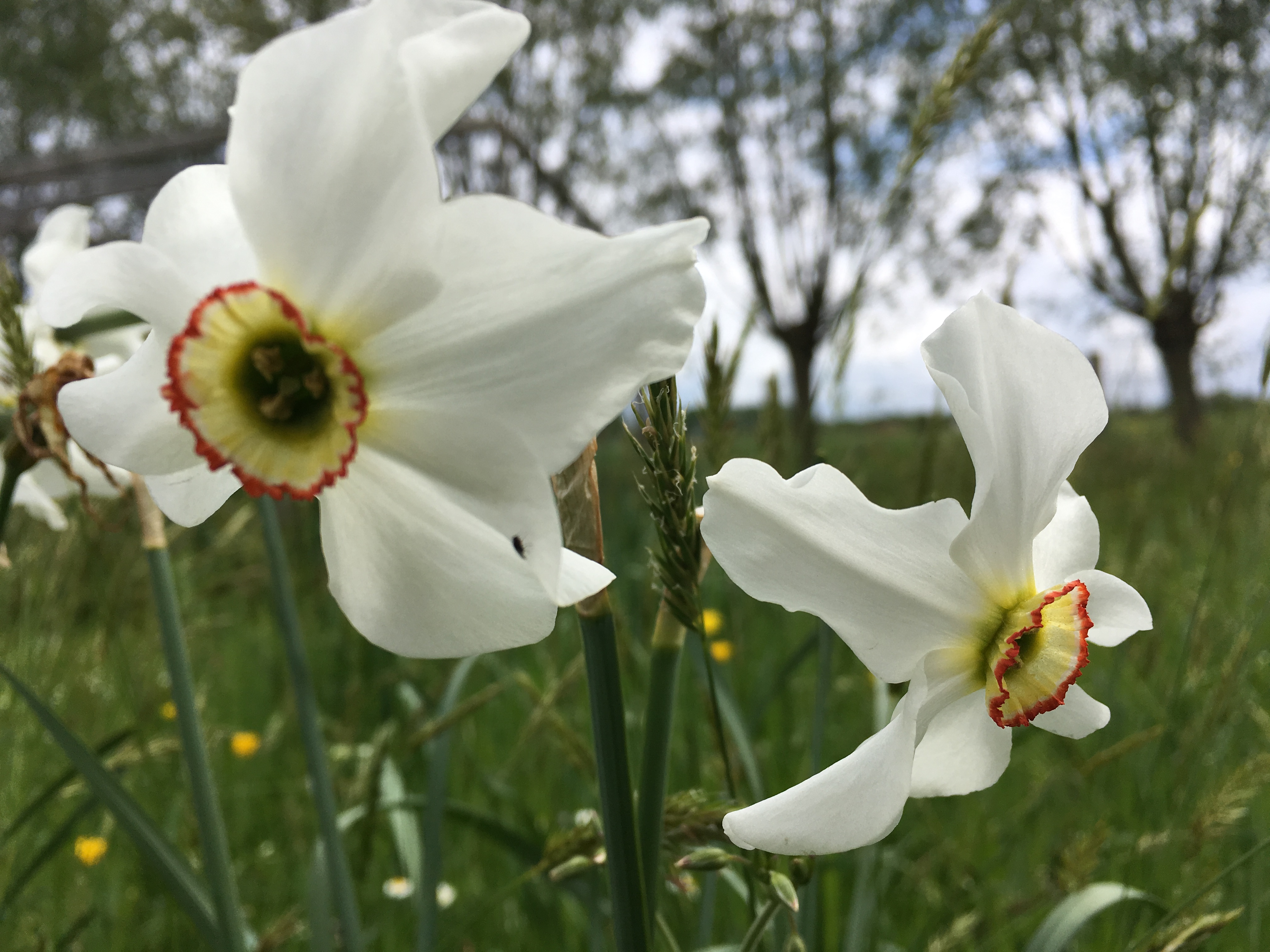 De Narcissus poeticus, prachtig vind ik hem! Met zijn kleine zachtgele trompetje met rood randje. Hij staat nu in bloem, één van de laatst bloeiende narcissen. Het waren de eerste biobloembollen die ik kocht drie jaar geleden. En ik kan me niet voorstellen dat ik er zo veel in de grond stopte. Zoals beloofd, verwildert hij dus echt!