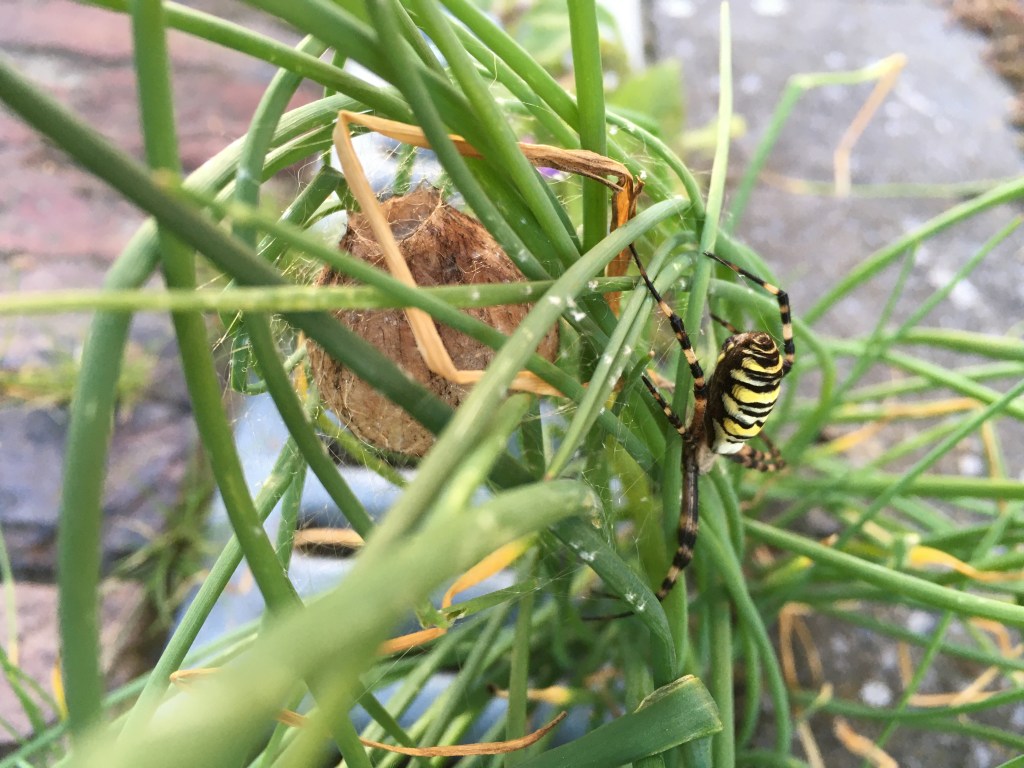 Het was al namiddag en ik snakte naar thee en de zon. Nog slaapdronken strompelde ik het terras op en toen zag ik ze zitten: een wespspin. Een prachtig exemplaar. Gewoon tussen wat stengels van bieslook die zich uitgezaaid had tussen de stenen. Lekker warm …
