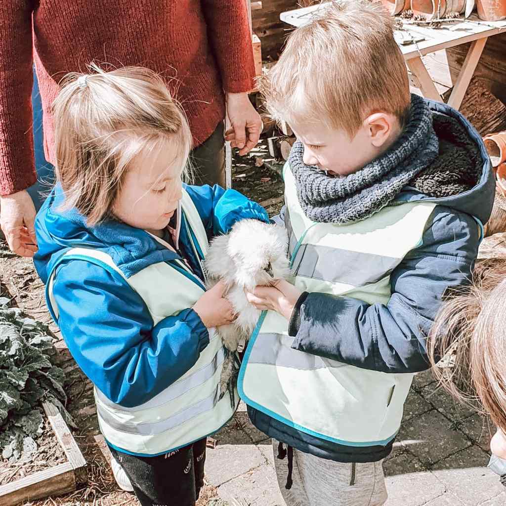 Om half één kwamen Frauke en Iris met die hele bende schattigheid door het tuinpoortje gestapt. Tijd om kennis te maken met onze kippen. Er werden eitjes geraapt en kippen geaaid en vastgehouden. De kinderen vroegen honderduit over eieren en kuikentjes en of er nu kuikentjes in die eieren zaten. Als onze haan een lekker hapje vond en zijn kippen riep om het op te eten, daarvan vielen hun mondjes open. De kip die steeds op wandel ging, dat vonden ze grappig. (“Blijf in uw kot!” van Maggie De Block is niet aan haar besteed.)