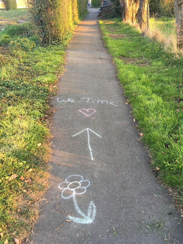 De kindjes gingen van aan het station langs de veldbaantjes naar onze tuin wandelen. Dat was een kans om nog eens het kind in mezelf los te laten en ‘pijltje trek’ te doen. Met krijt hartjes, bloemetjes en pijlen op straat tekenen, dat was lang geleden. En zo vonden de kleuters de weg.