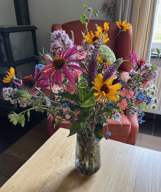 Onze bedoeling is immers niet een broodwinning te maken van onze pluktuin. We willen vooral de buurvrouw helpen, de overleden buurman eren, een mooie, biodiverse tuin maken en om uit onze kosten te komen, de gekweekte bloemen verkopen. We denken ook workshops te geven voor buurtbewoners. Onze liefde voor de natuur delen en hopelijk zo ook de biodiversiteit een boost te kunnen geven. Er komt geen gif in onze pluktuin en naast plukbloemen willen we er ook inheemse wilde planten voor onze wilde bijen zetten.