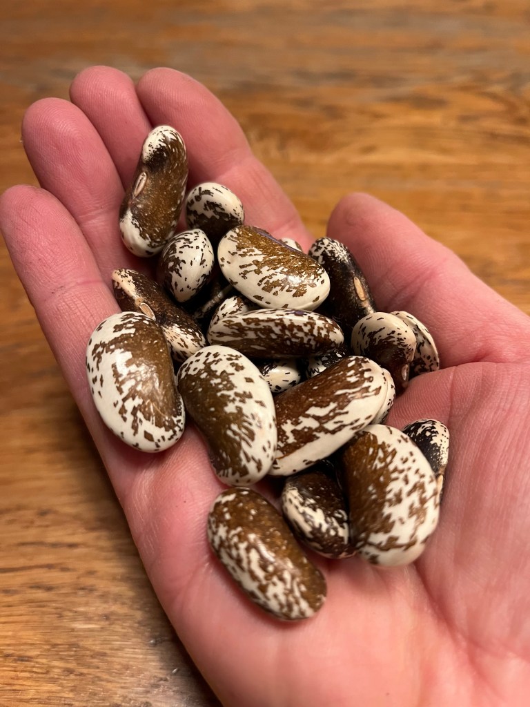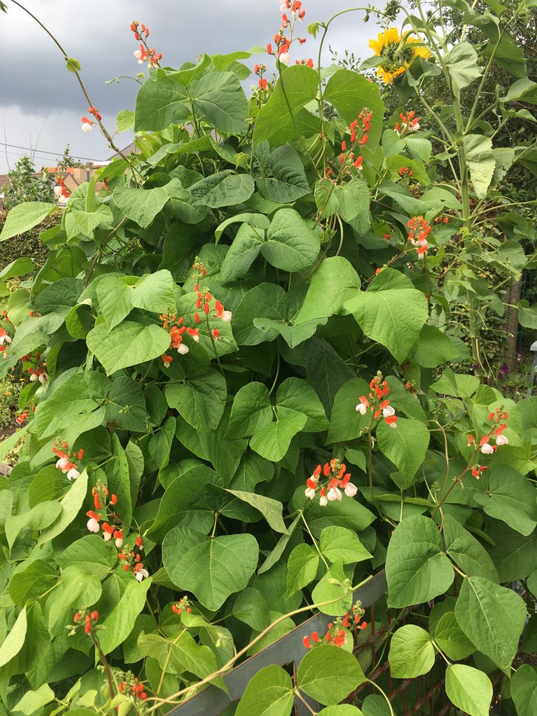Vorig jaar zaten er in die doos mooie grote pronkbonen (Phaseolus coccineus). Ik had die ooit al eens in een tuin zien bloeien dus wilde die wel eens proberen.