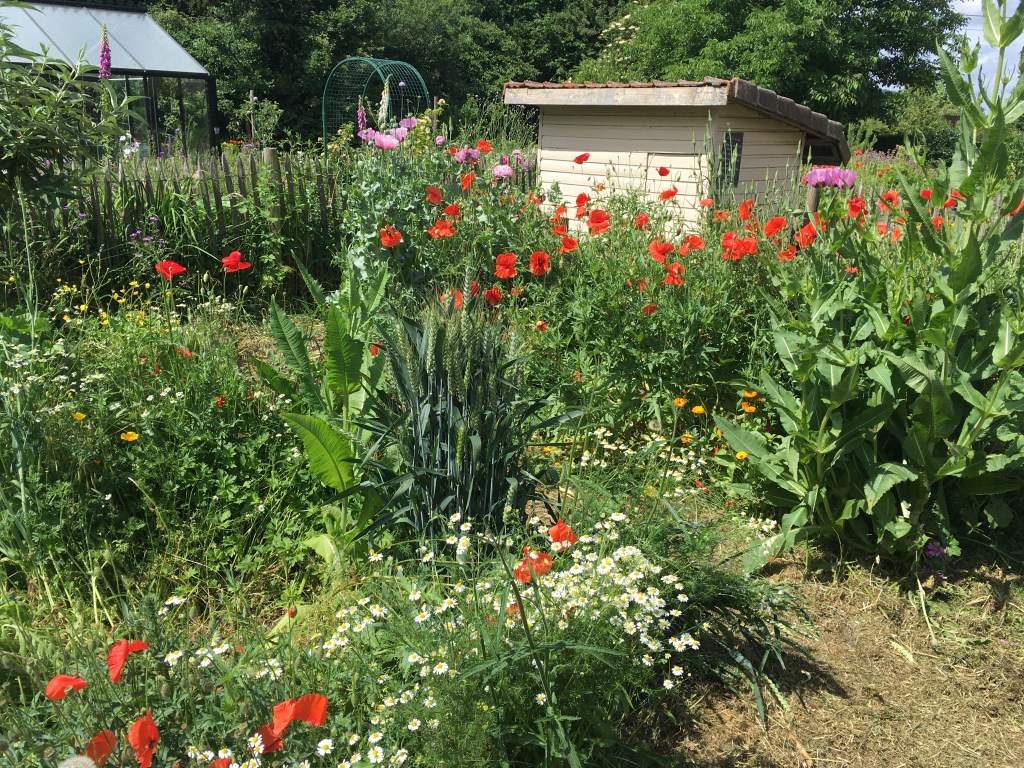 Wij mochten van de eigenaars tijdens de aanleg van onze zwemvijver, de grond die eruit kwam er tijdelijk op parkeren. En op 4 juni tijdens de Ecotuindag op 4 juni mogen we ons tentje van Velt erop zetten. In ruil daarvoor onderhoud ik het nu een beetje. Ik zou er heel graag een bloemenweide van maken. Ik kreeg er al wat boterbloemen, smeerwortel, knoopkruid, rolklaver, witte dovenetel, wilde kaardebol in maar er staat ook nog steeds zeer veel vet gras. En dat gras moet je juist temmen door te maaien in mei én het grasmaaisel af te voeren. Dan kan het geen zaad zetten en put het uit.