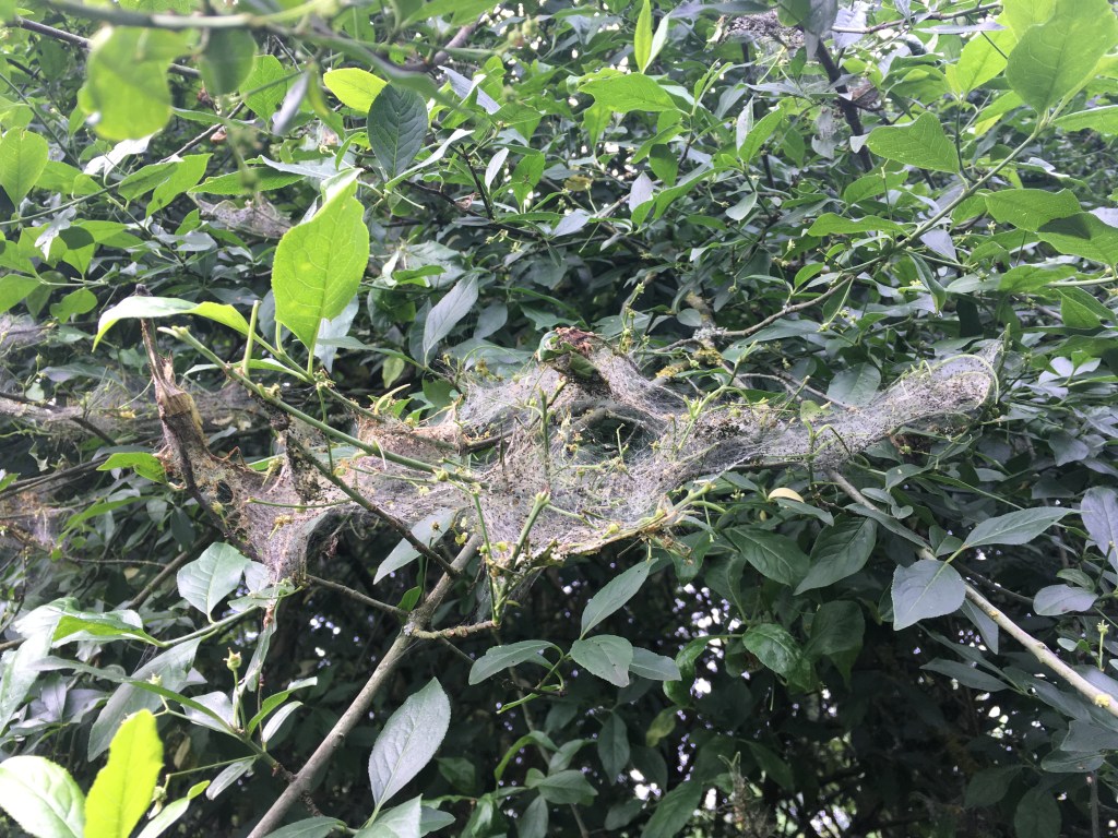 In het vogelboske hangen slierten en webben. Jakkes! Sommige struiken zijn zelfs helemaal kaalgevreten. Het is een troosteloos en griezelig gezicht. En toch kan dit helemaal geen kwaad.